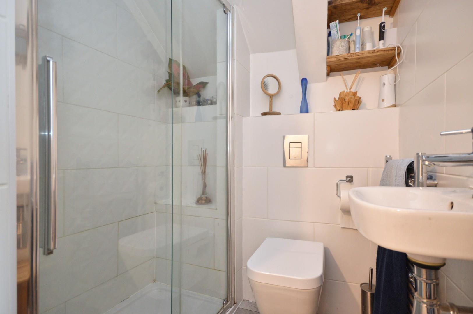 Tiled flooring, mostly tiled walls, concealed cistern w/c, wall mounted wash hand basin with chrome mixer tap over, chrome heated towel rail, shower cubicle with sliding glazed door and mains shower over, inset spots, extractor.