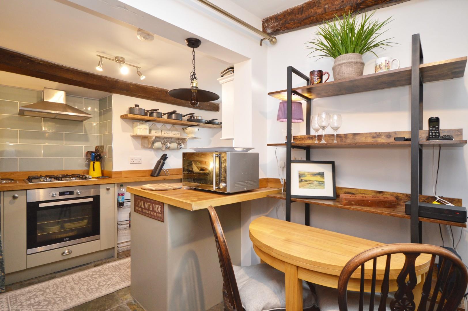 Double glazed window to front aspect, exposed wooden beams, floor units with wooden worksurface over, Belfast style sink with mixer tap over, space and plumbing for automatic washing machine, electric oven with gas 4 ring hob over and extractor hood, space for freestanding fridge freezer.