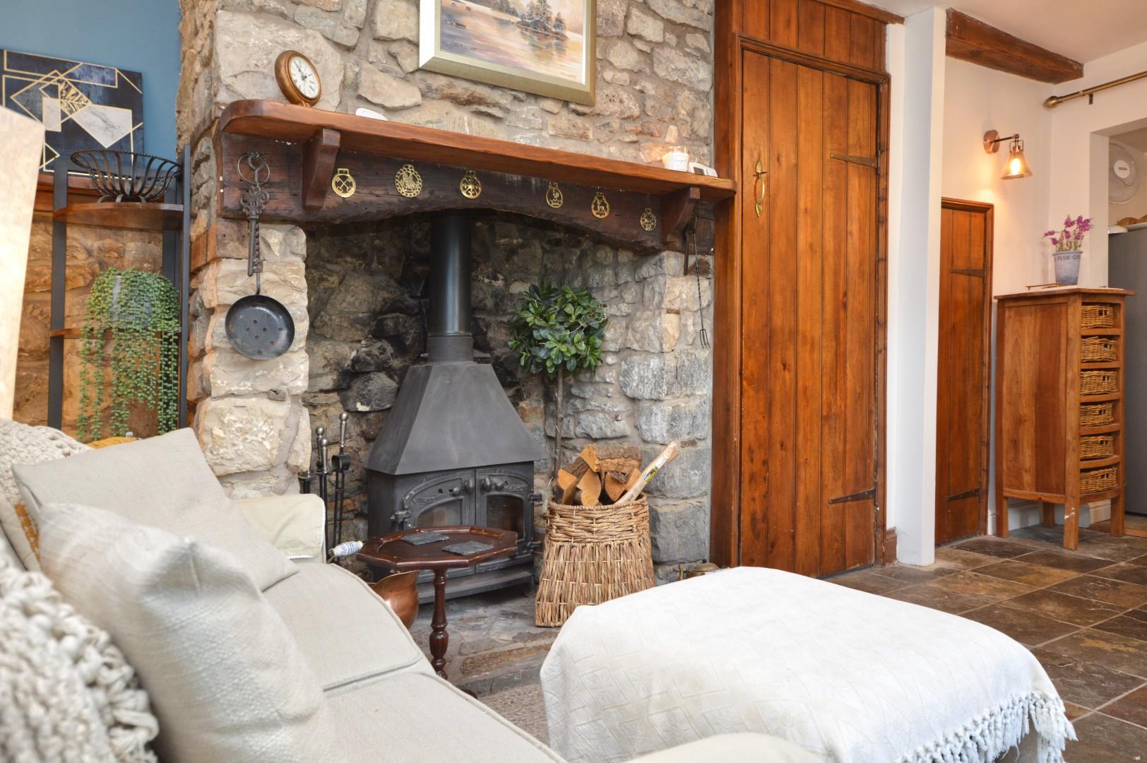 Double glazed window to front aspect, period radiator, exposed wooden beams, under stairs storage cupboard, Inglenook fireplace with feature woodburning stove with stone hearth, alcove shelving, tiled flooring, wall lights, door to kitchen, door with stairs rising to first floor landing.