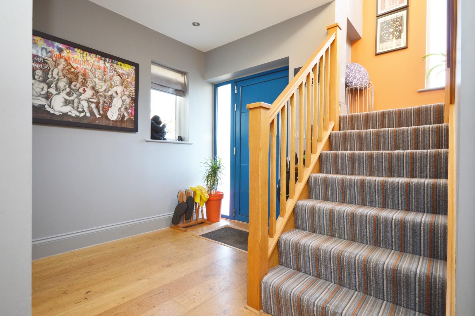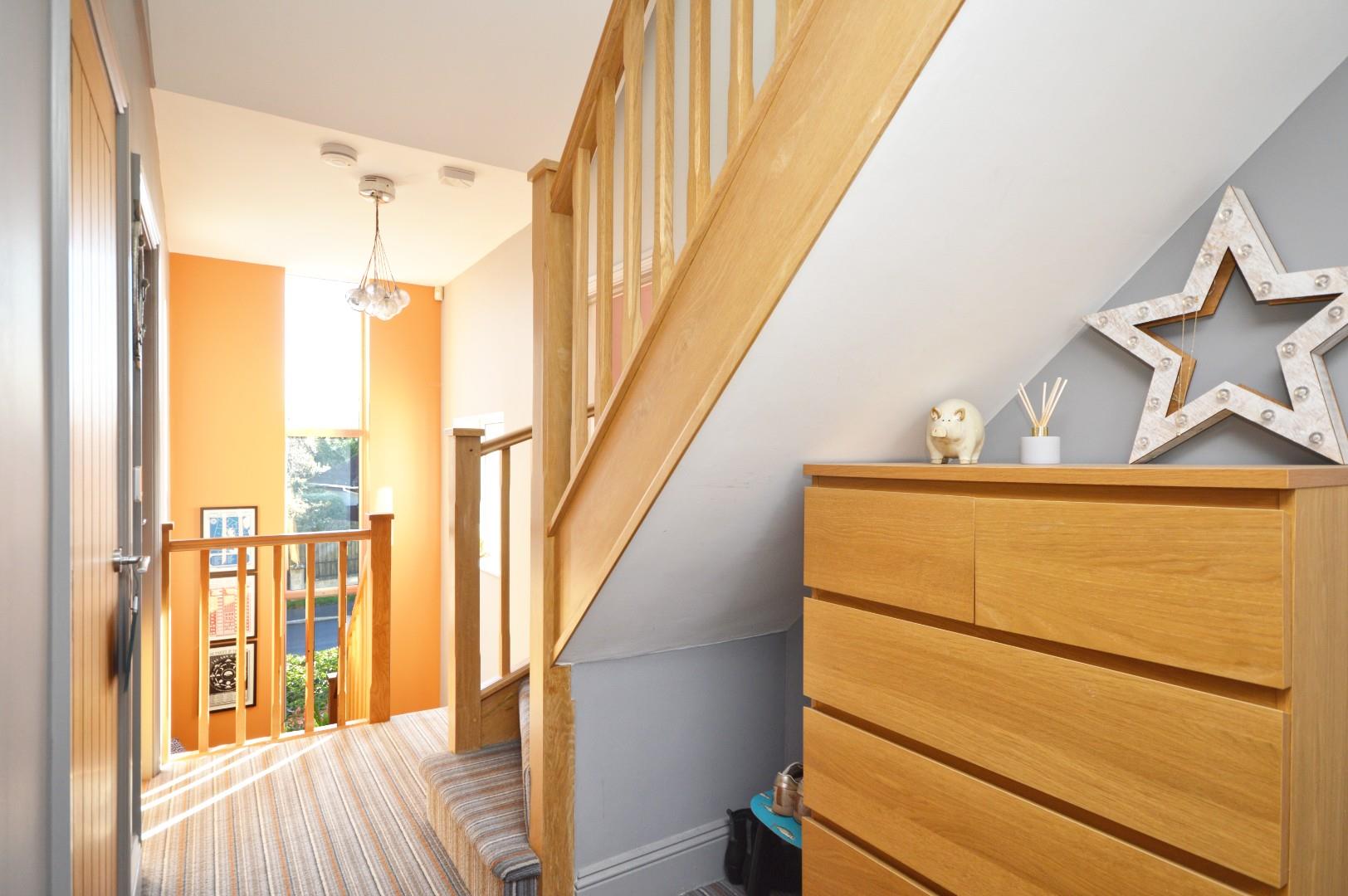Oak staircase rising to first floor landing, wood flooring, double glazed window to side aspect, radiator, spot lights, doors to