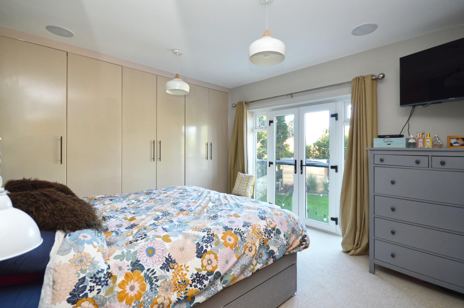 Double glazed French doors and windows to Juliette balcony overlooking the rear garden, built in wardrobes, door to