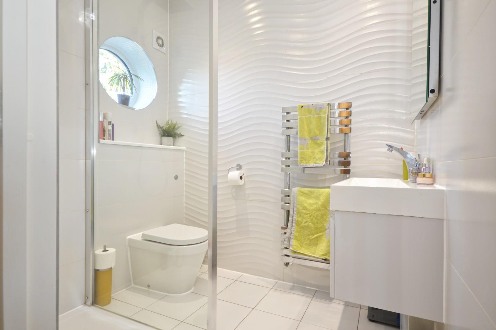 Circular double glazed window to rear aspect, Porcelanosa tiled walls and floor, white suite with chrome fittings comprising concealed cistern w/c, wash hand basin with mixer tap over and drawers beneath, shower cubicle with rainfall shower and hand held thermostatic shower over, illuminated heated mirror, heated towel rail, storage cupboard.