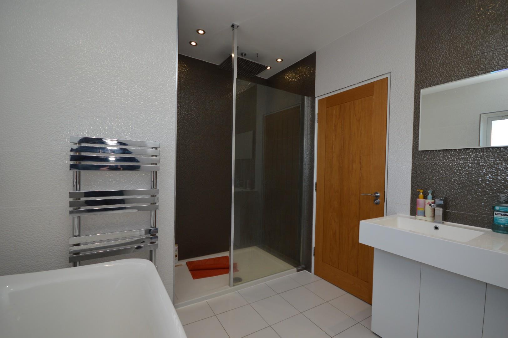 Obscured double glazed window to front aspect, Porcelanosa tiled walls and floor, white suite with chrome fittings comprising freestanding bath, low level w/c, double sinks with storage beneath, large tiled shower cubicle with rainfall shower over, spotlights, heated towel rail.