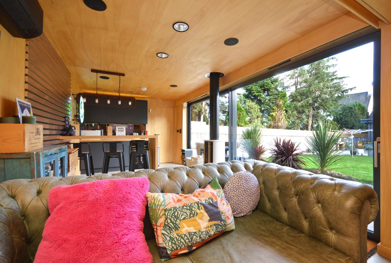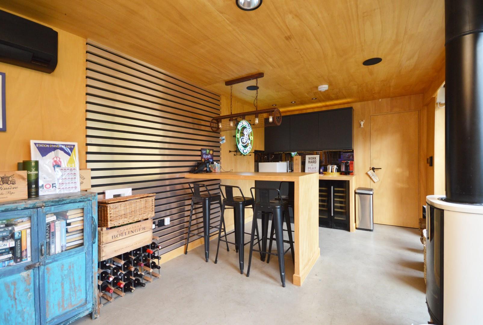 Double glazed sliding patio door onto the rear garden, the kitchen is well equipped with a Belfast style sink, two wine fridges, integrated fridge and dishwasher, air conditioning and underfloor heating provided by an air source heat pump, feature woodburning stove and concealed pull down double bed within a wall cupboard. The cinema hardware including projection screen etc is available by separate negotiation.