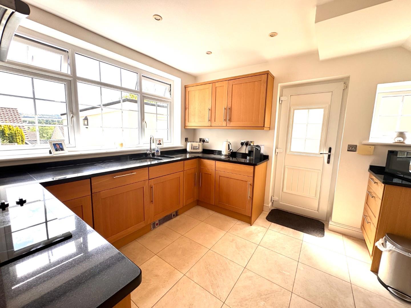 uPVC double glazed window to rear aspect, tiled flooring, uPVC double glazed pedestrian door to side aspect, uPVC obscured double glazed window to side aspect, a range of modern wall and floor units with black granite worksurfaces over, single 1/12 bowl Franke sink with mixer taps over, 4 ring electric hob with stainless steel splash back and extractor hood with light over and Neff oven and grill beneath, built in full sized dishwasher, under unit lighting, inset spots, built in fridge and freezer, built in washing machine.