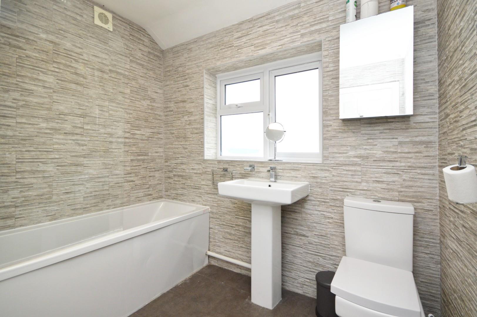 Obscured uPVC double glazed window to rear aspect, suite comprising paneled bath with rainfall shower over, wash hand basin with mixer tap, close coupled w/c, heated towel rail, storage cupboard.
