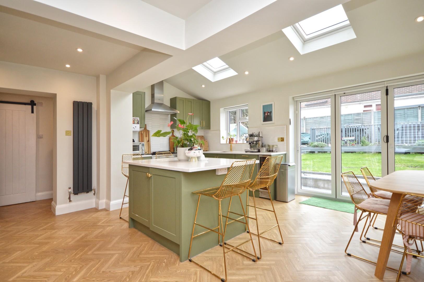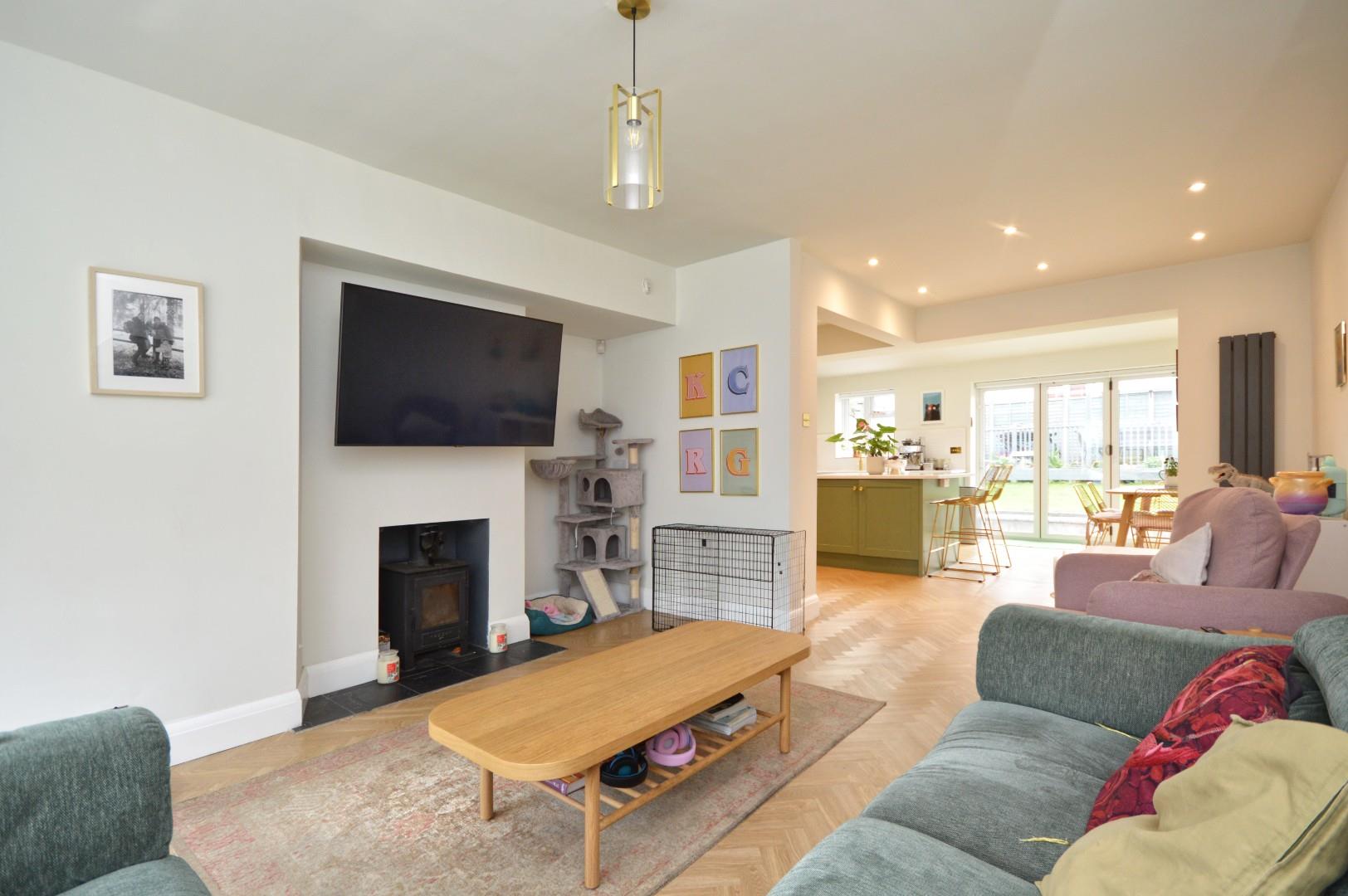 uPVC double glazed window to front aspect, double radiator, feature freestanding woodburning stove, LVT flooring, open plan into kitchen/dining room. Aluminum bi-folding doors to rear aspect, uPVC double glazed window to rear aspect, LVT flooring, a recently refitted kitchen with a range of wall and floor units with worksurface over, sink drainer unit with mixer tap over, integrated dishwasher, space for Rangemaster style cooker with extractor over, space for American style fridge freezer, island with storage beneath and worksurface over with breakfast bar area, 2 Velux windows to rear aspect, spot lights, wall mounted radiator, opening to