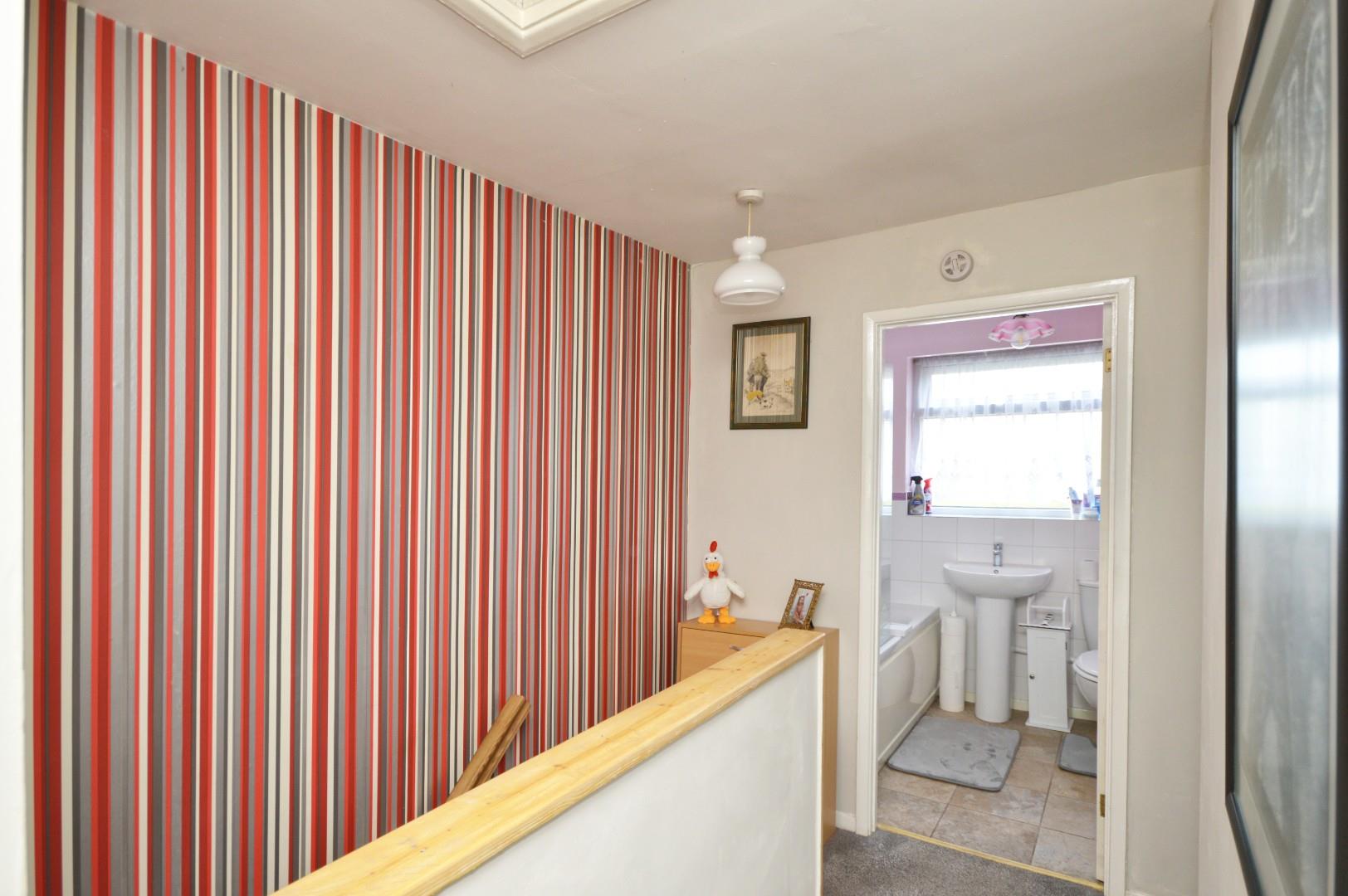 uPVC double glazed obscured window to rear aspect, paneled bath with shower attachment over, pedestal wash hand basin with mixer taps, close coupled w/c, heated towel rail, part tiled.