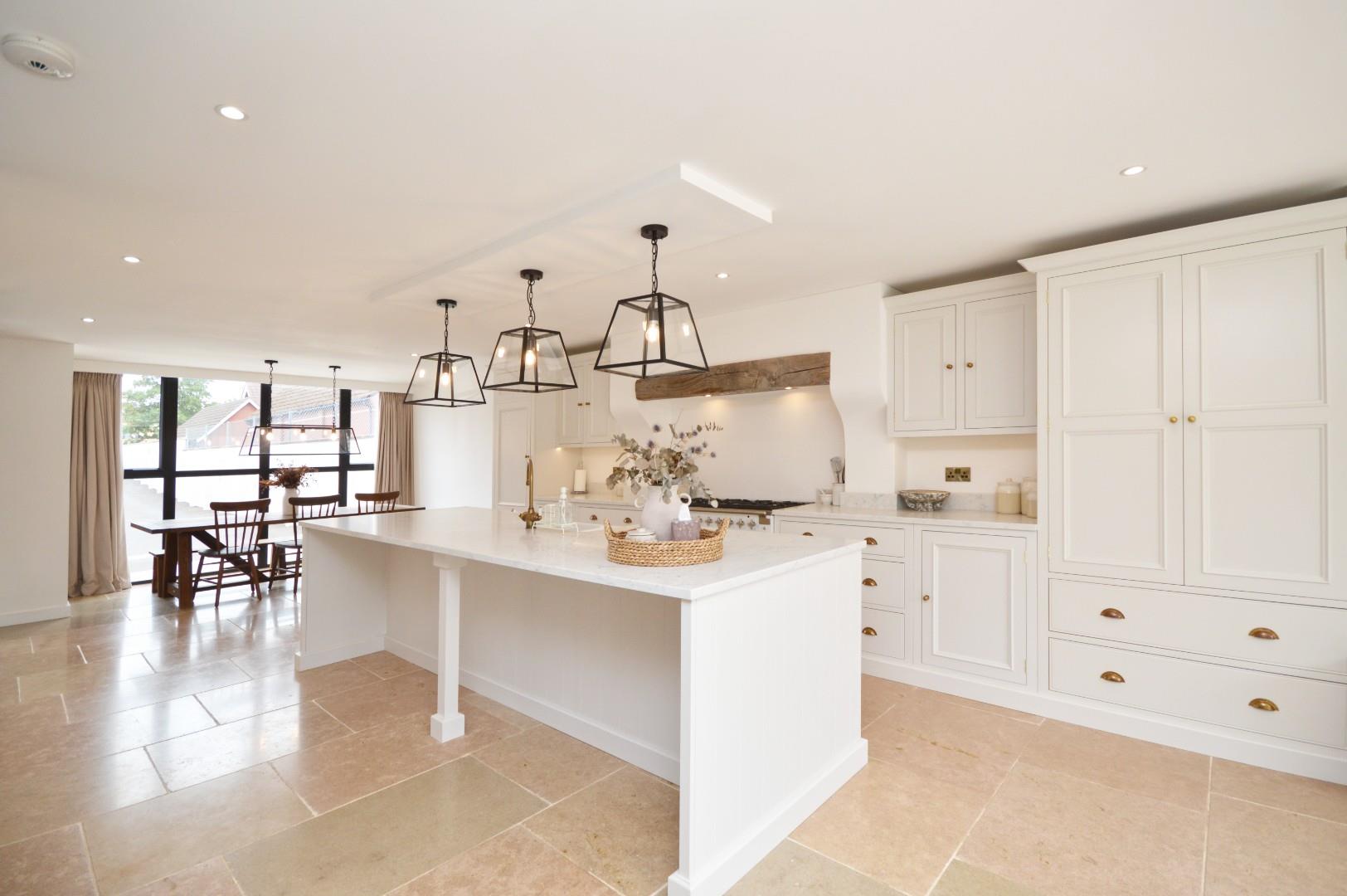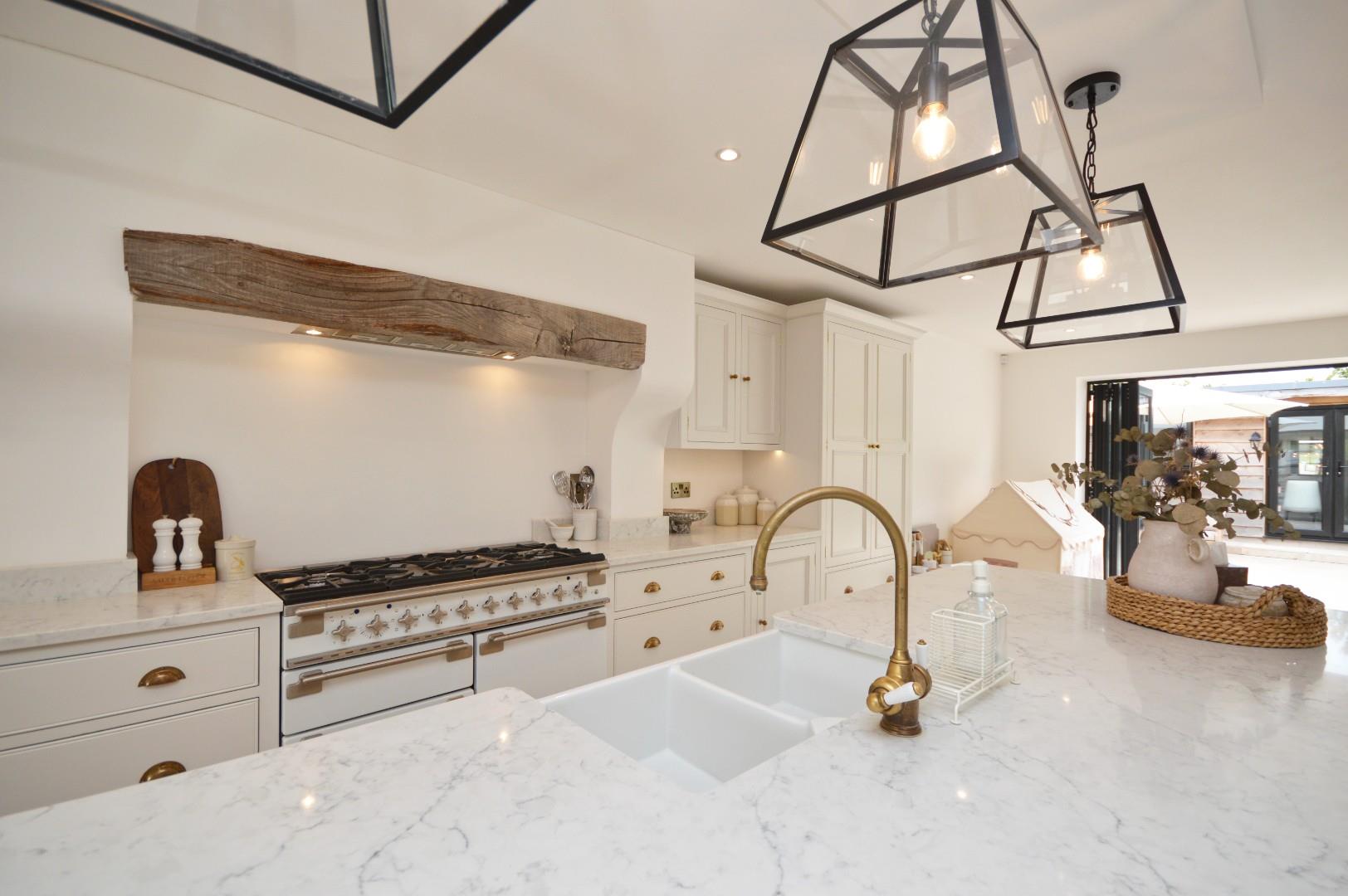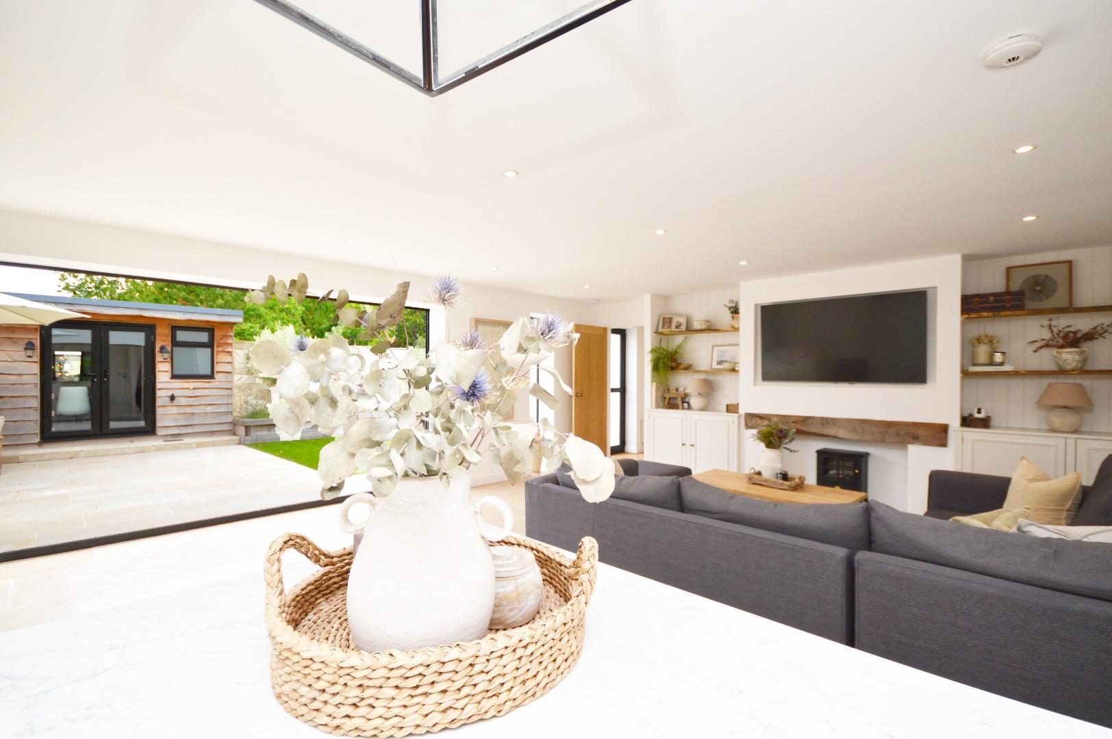 Dual aspect windows to front and rear aspects, bi-folding doors to patio and rear garden, inset spots, a Neptune kitchen comprising a range of floor and wall units with solid Quartz worksurfaces over, integrated appliances including fridge freezer, full sized dishwasher, space for a Rangemaster style cooker, bespoke pantry cupboard with Oak cabinetry, pan drawers, central island with double Belfast style sink with mixer taps and Perrin and Rowe hot water tap and Neptune pendant lights over, ample space for bar stools, alcove storage to the lounge area with antique style shelving, door to