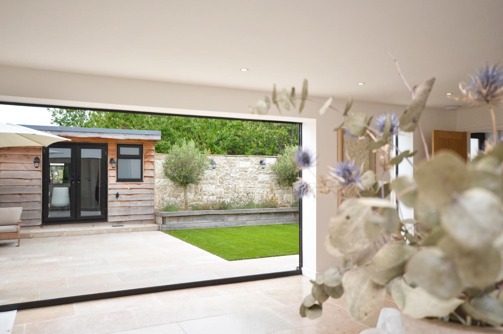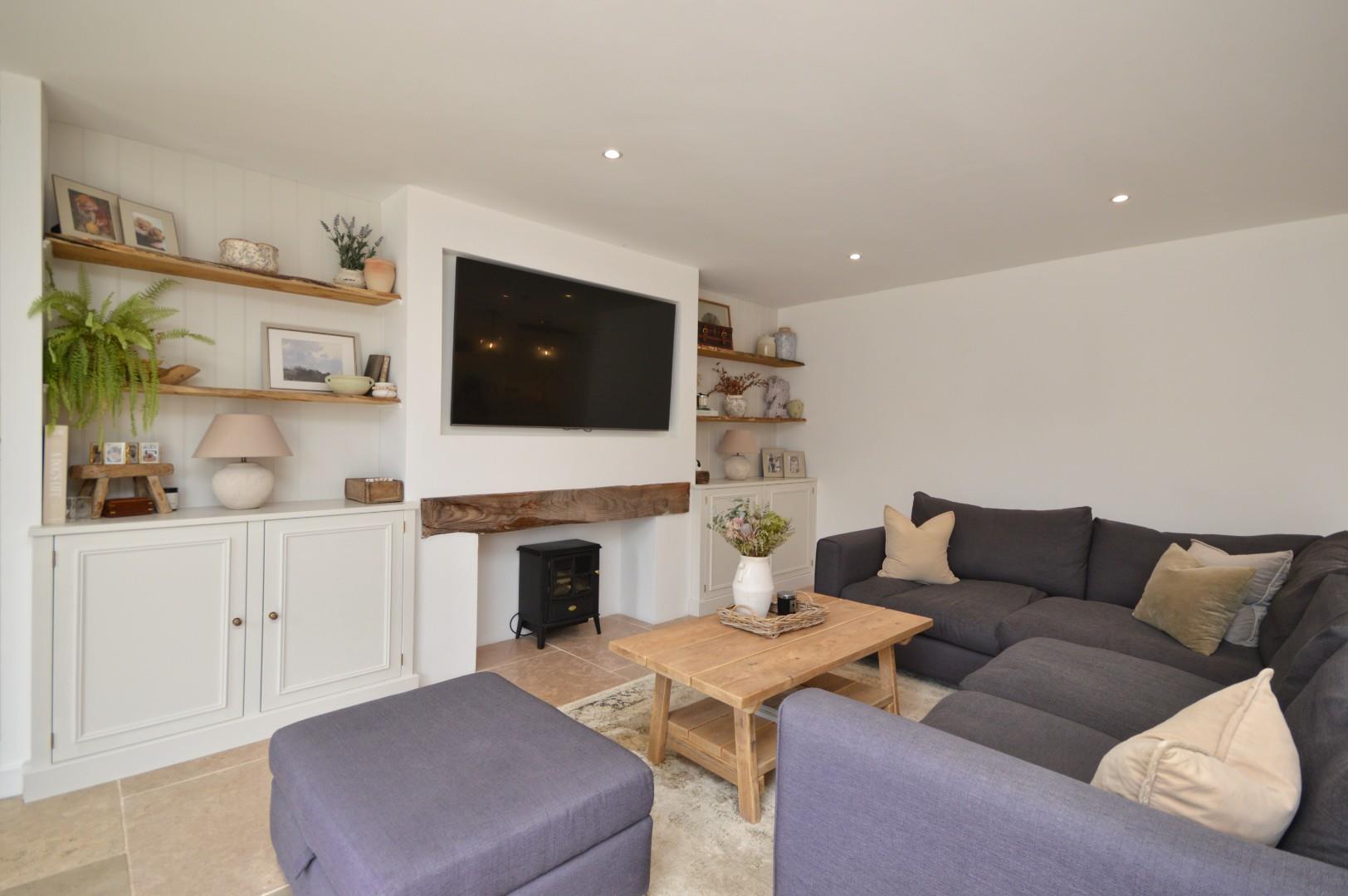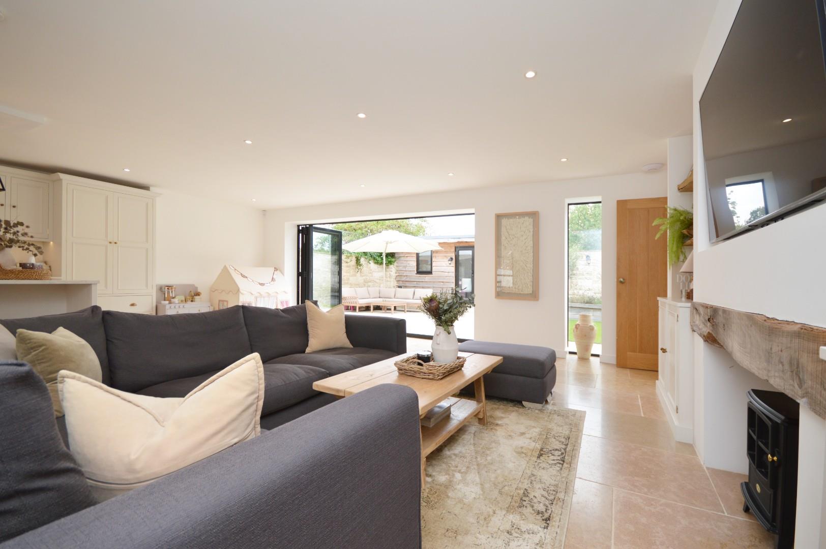 Dual aspect windows to front and rear aspects, bi-folding doors to patio and rear garden, inset spots, a Neptune kitchen comprising a range of floor and wall units with solid Quartz worksurfaces over, integrated appliances including fridge freezer, full sized dishwasher, space for a Rangemaster style cooker, bespoke pantry cupboard with Oak cabinetry, pan drawers, central island with double Belfast style sink with mixer taps and Perrin and Rowe hot water tap and Neptune pendant lights over, ample space for bar stools, alcove storage to the lounge area with antique style shelving, door to