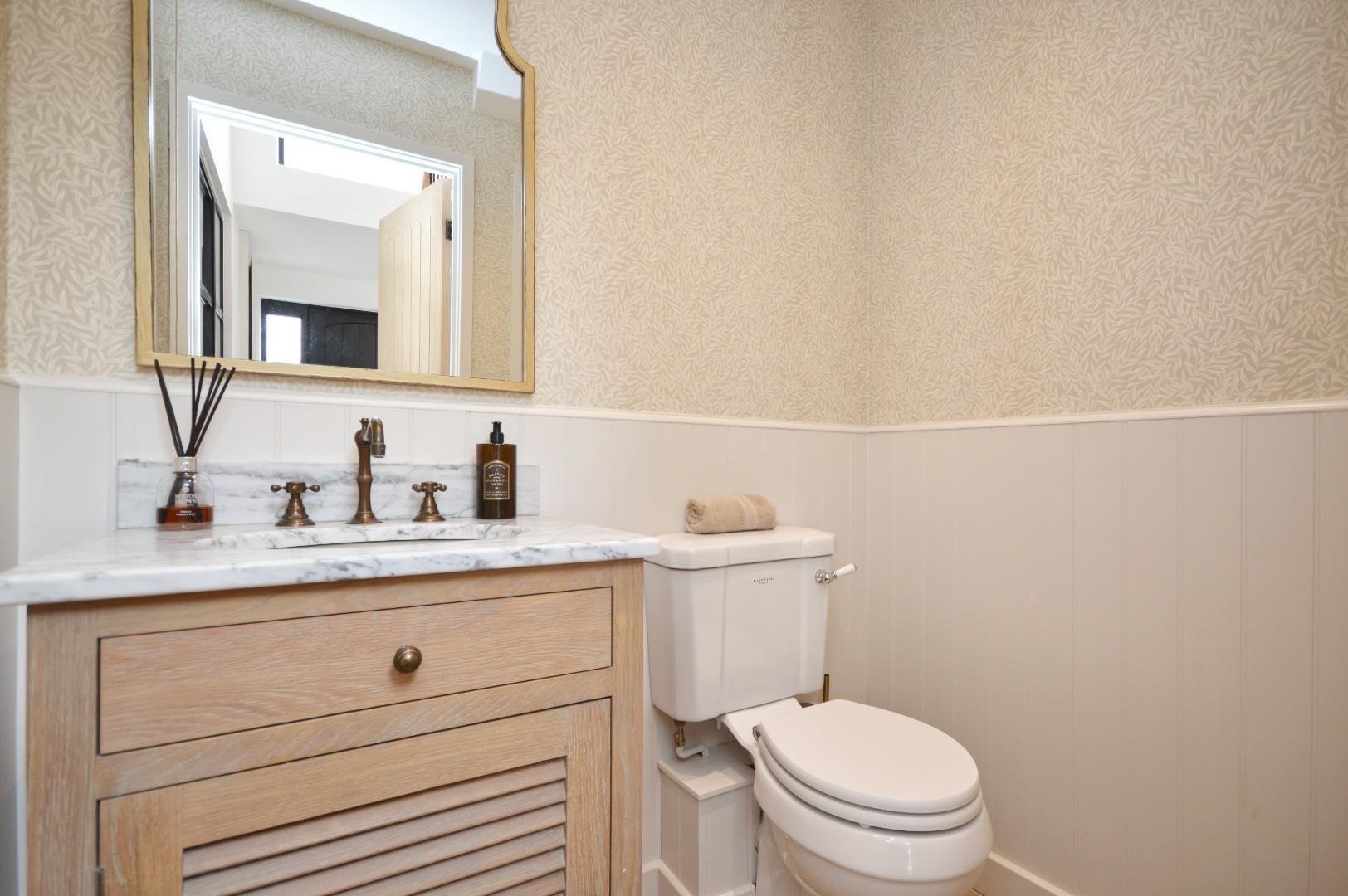 Suite comprising low level w/c, Neptune wash hand basin with marble worktop and mixer taps, storage beneath, part panelled walls, inset spots, extractor, understairs storage cupboard, Mandarin Stone limestone tiles.