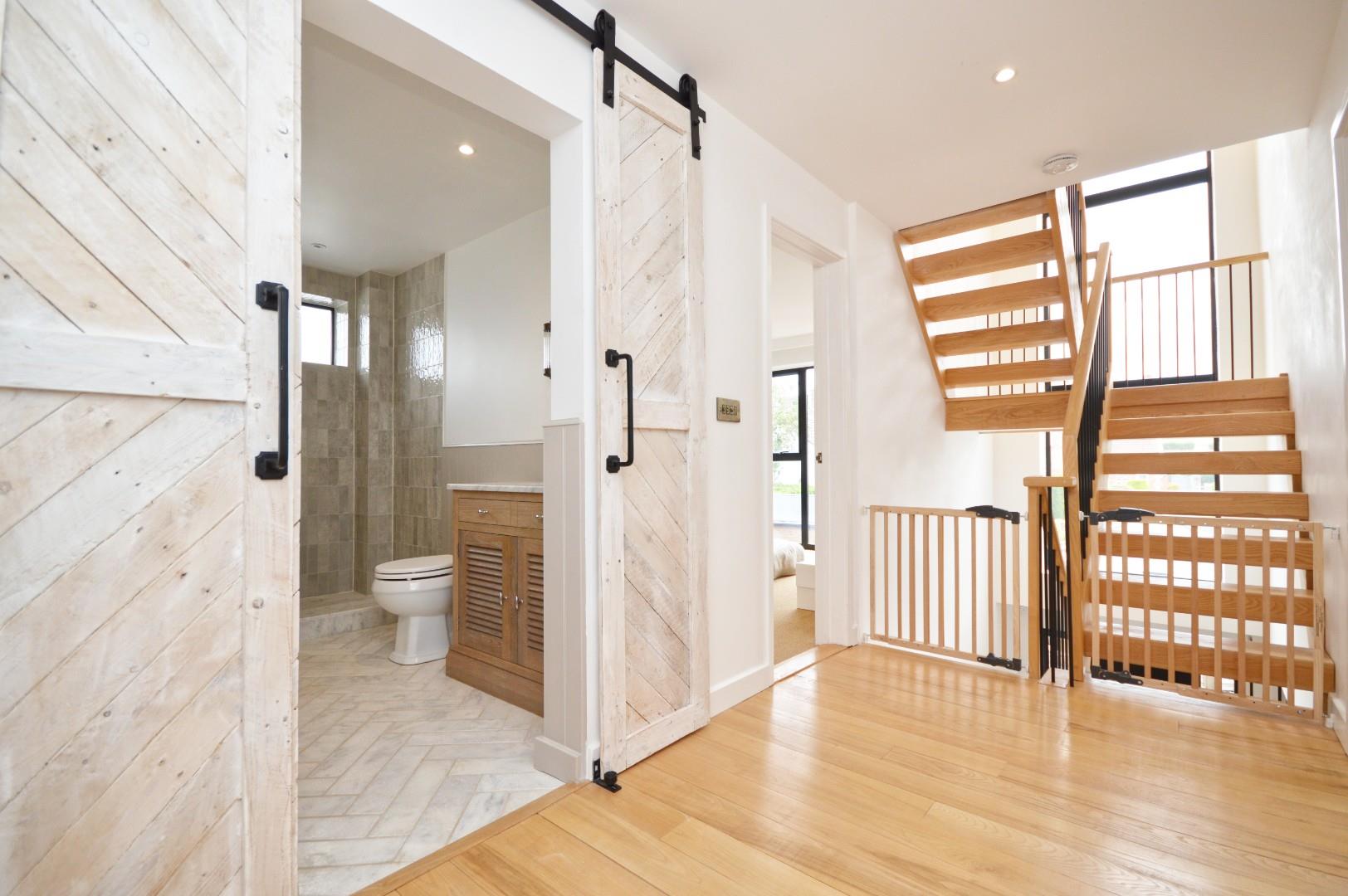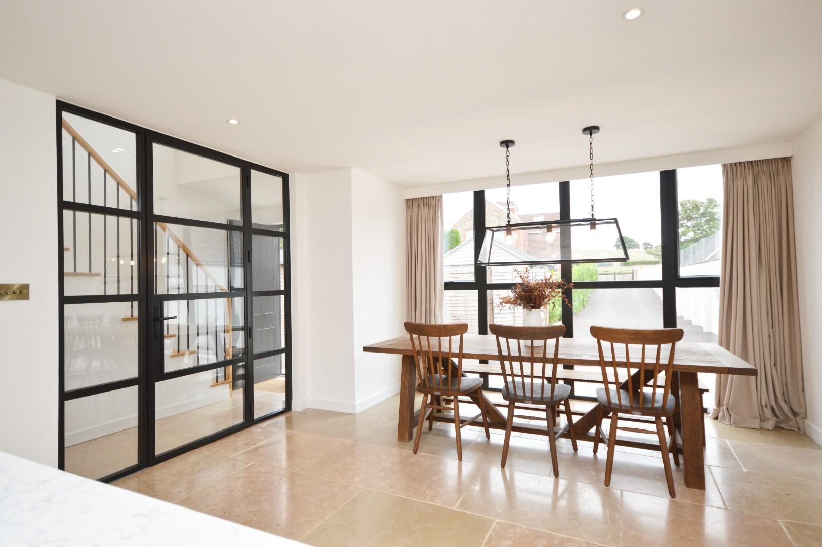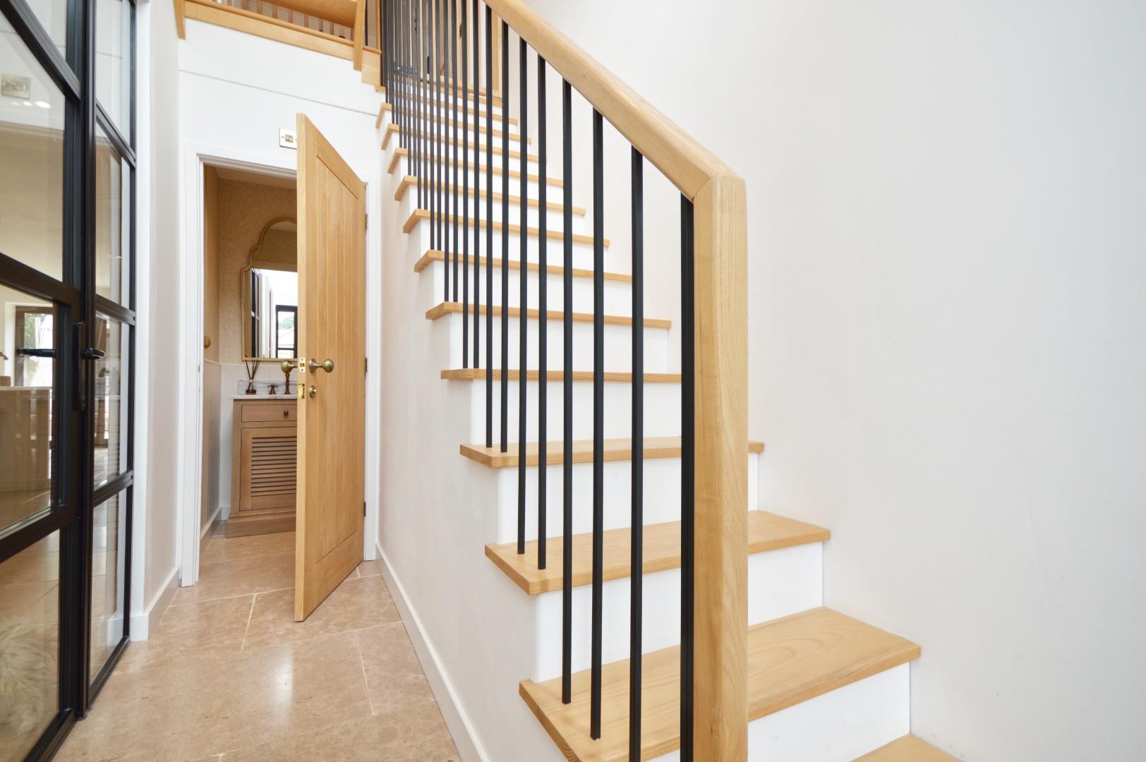 Bespoke solid ash staircase rising to first floor landing, storage cupboard with shelving, door to cloakroom, black Critial windows with matching side panels into L-shaped open plan living/kitchen area.