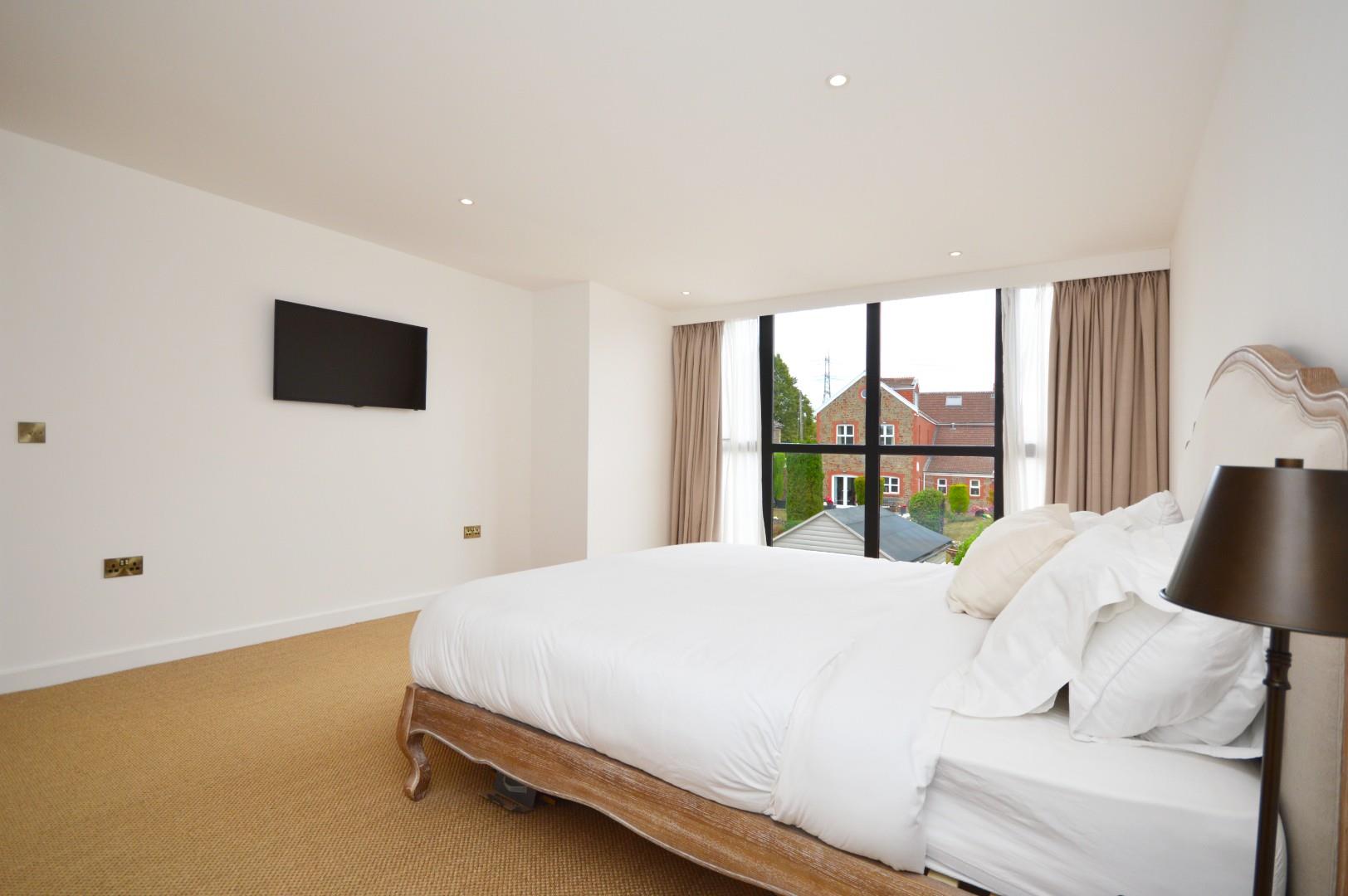 Obscured glazed window to side aspect, Neptune tiled flooring, suite comprising Bayswater London w/c, Neptune sink with marble worksurface over and brass taps over with storage beneath, wall lights, freestanding bath with freestanding tap with separate brass shower attachment, heated towel rail, part panelled walls, fully tiled shower cubicle with central drain and rainfall shower with separate attachment and controls, part fixed glazed shower screen, inset spots, extractor.