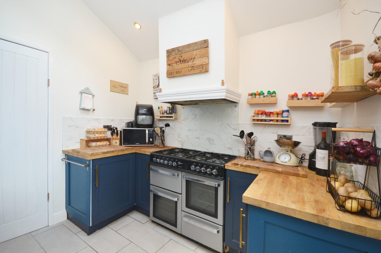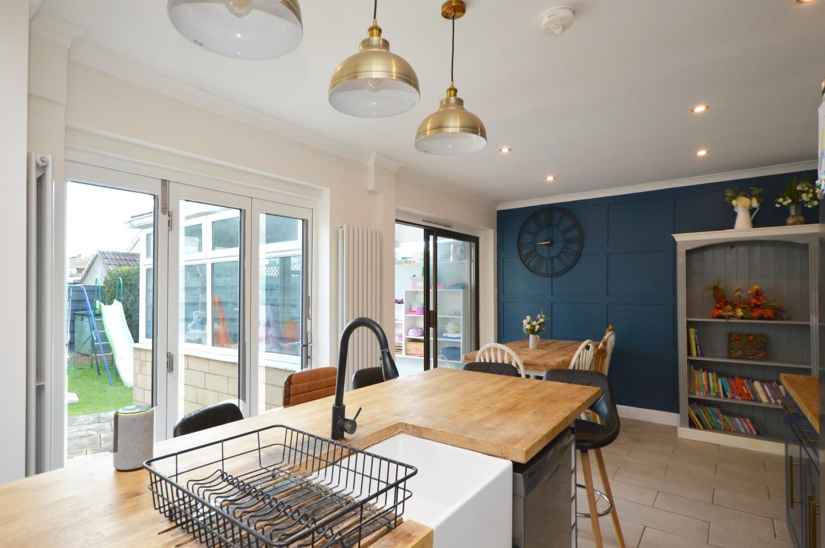 uPVC double glazed bi-folding doors to rear garden, sliding doors to conservatory, a recently refitted kitchen with a range of wall and floor units with solid wood worksurface over, Belfast style sink with taps over, space for Rangemaster style cooker with fitted extractor hood over, breakfast bar, two separate radiators, space for American style fridge freezer, Velux window to side aspect, spot lights, door to