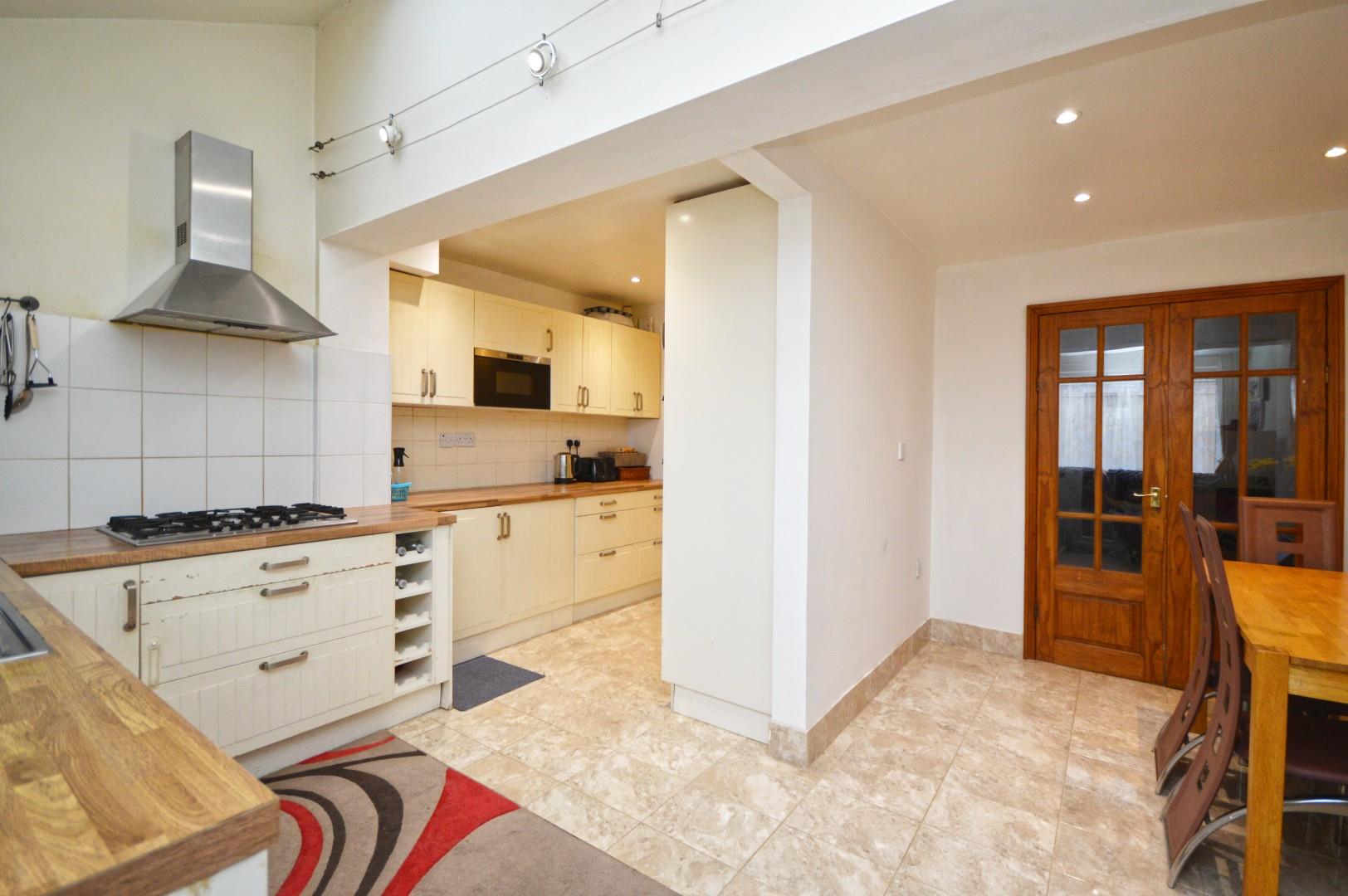 uPVC double glazed window to rear aspect, uPVC double glazed patio doors opening to rear garden, a range of wall and floor units with worksurface over, sink drainer unit with mixer taps over, integrated gas hob with fitted extractor over, integrated dishwasher, washing/drier, double oven, microwave and fridge freezer, space for additional freestanding fridge freezer, 2 Velux windows to rear aspect, spotlights, tiled flooring, radiator.