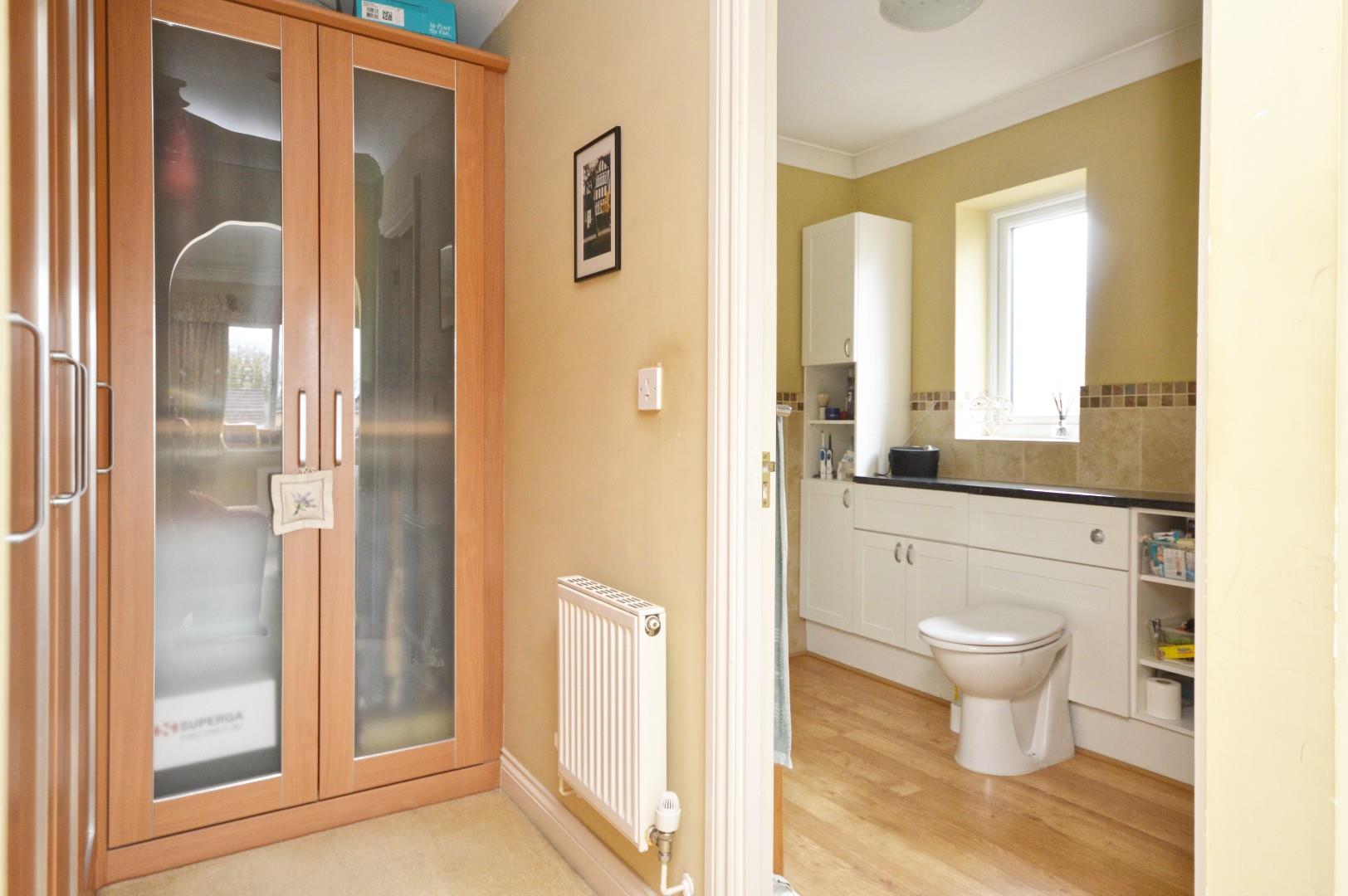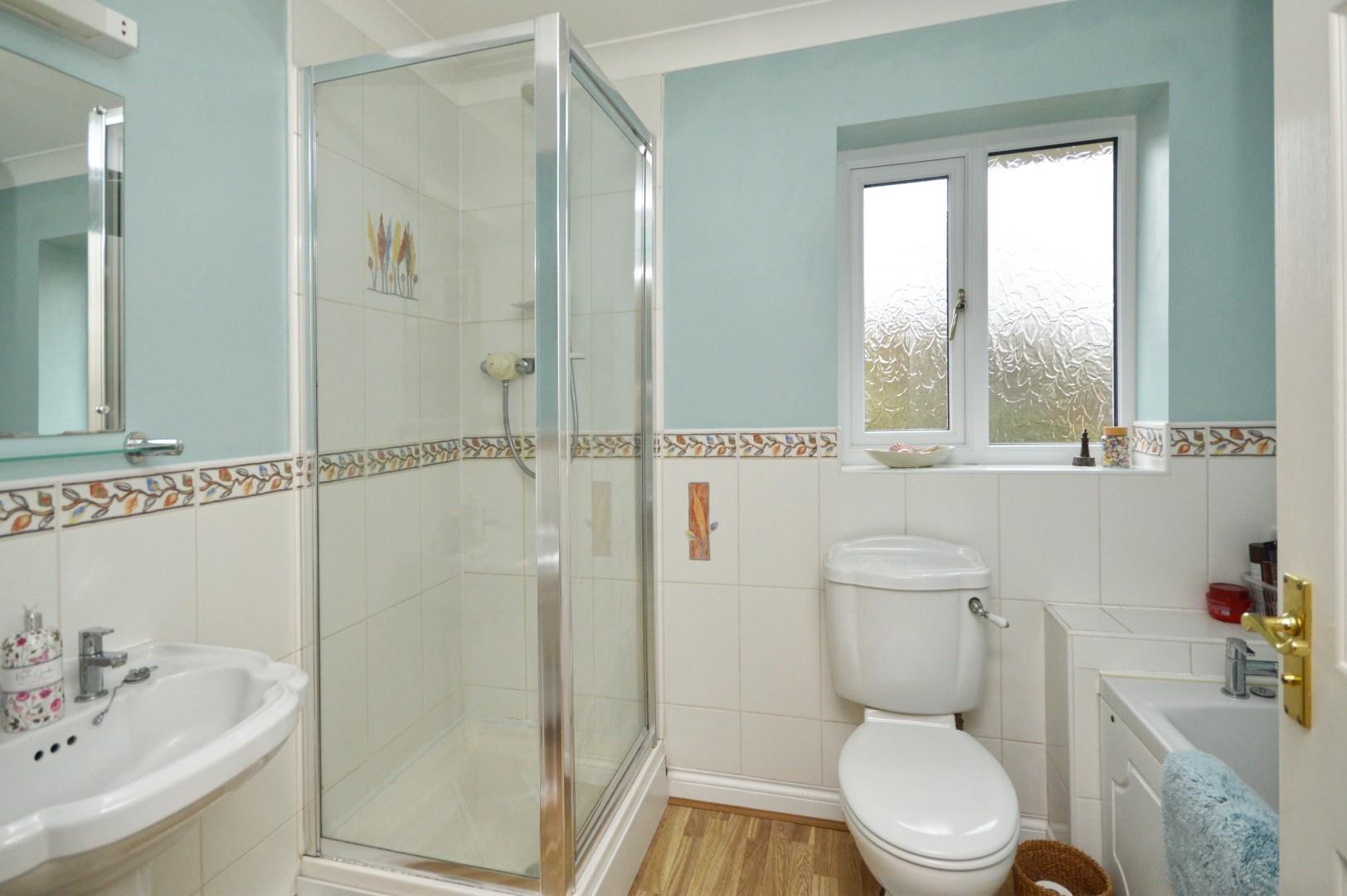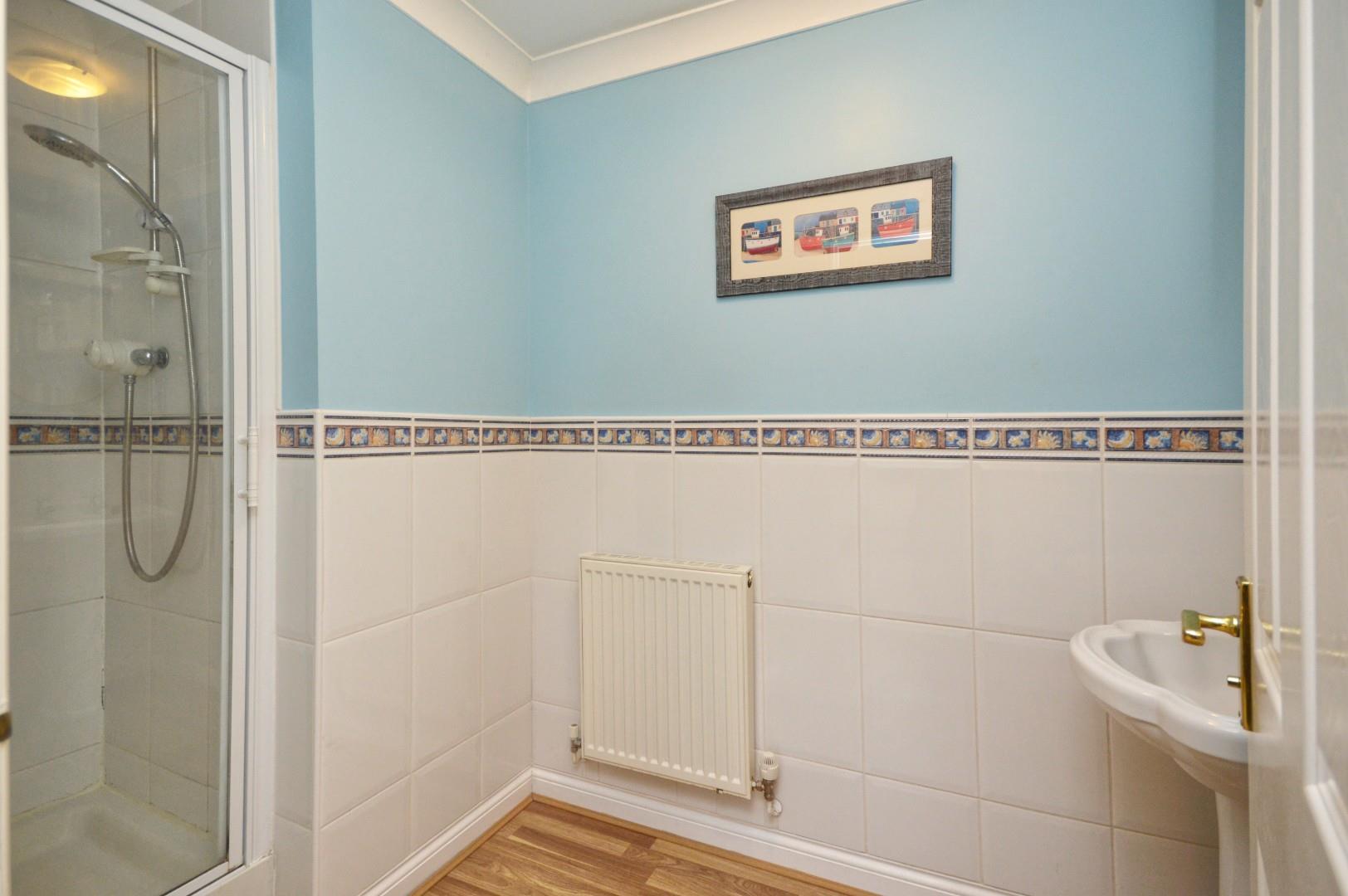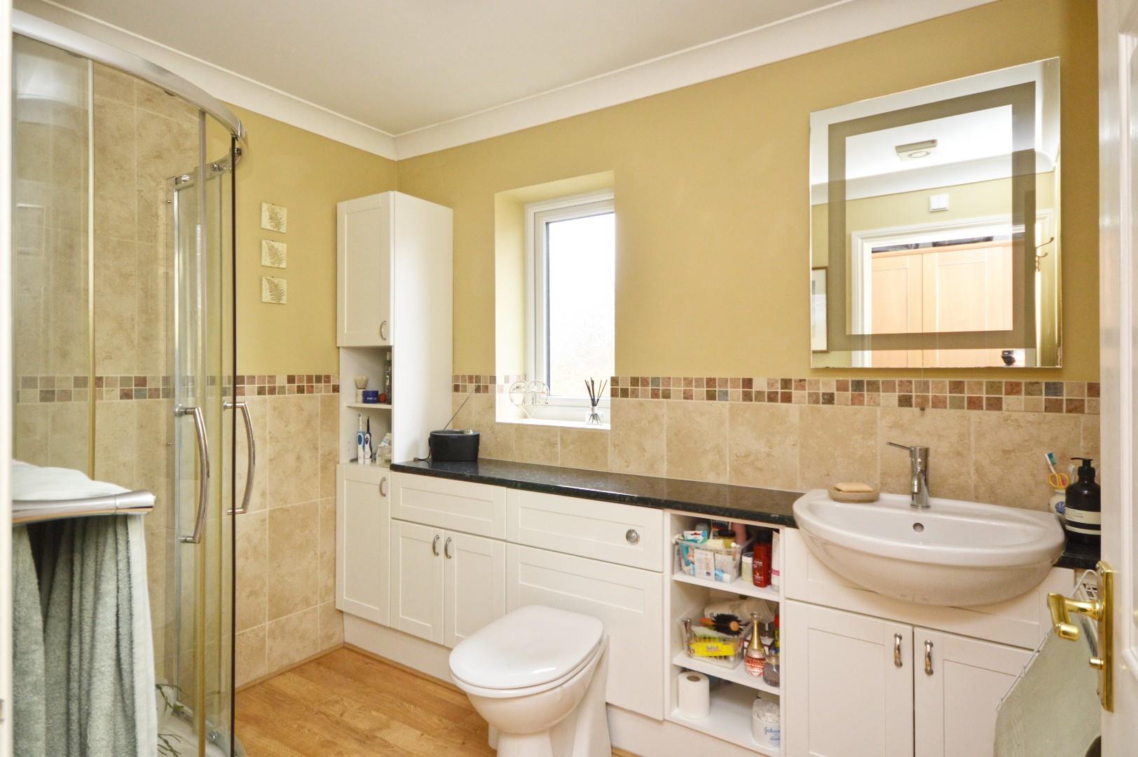 Obscured uPVC double glazed window to side aspect, close coupled w/c, wash hand basin with mixer tap over and storage beneath, additional storage cupboards, fully tiled shower cubicle with shower over, single radiator, towel rail.