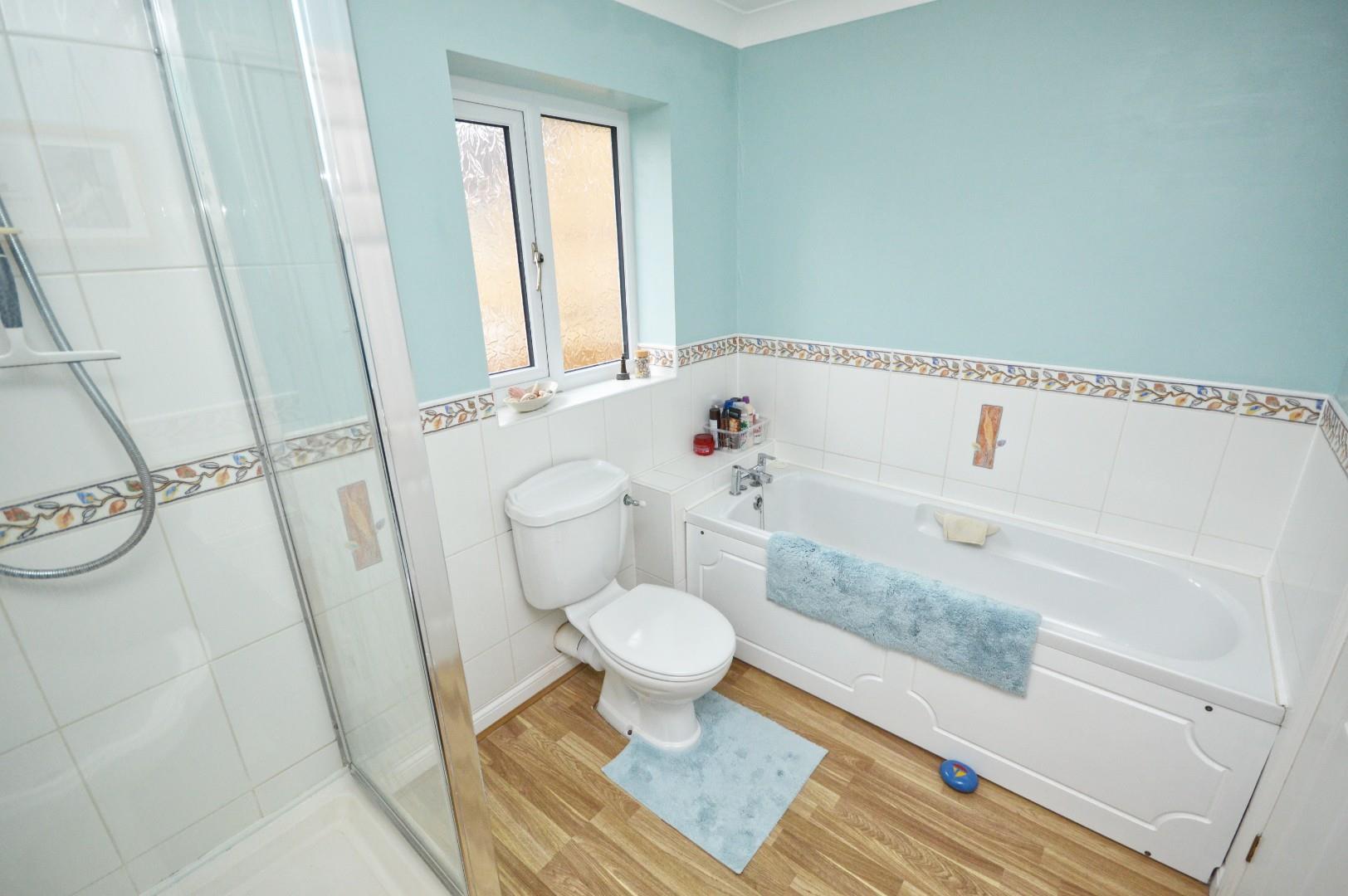 Obscured uPVC double glazed window to rear aspect, suite comprising panelled bath with taps over, close coupled w/c, pedestal wash hand basin with taps over, fully tiled shower cubicle, single radiator, extractor fan.
