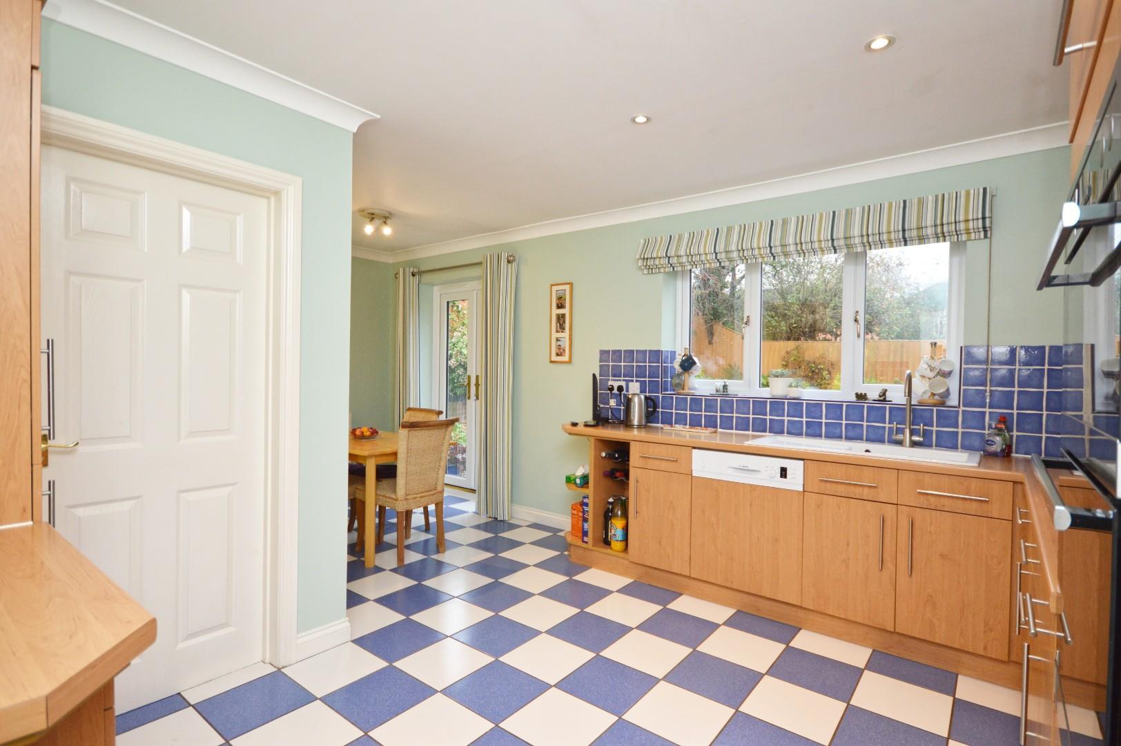 uPVC double glazed patio doors opening to rear garden, uPVC double glazed window to rear aspect, a range of wall and floor units with worksurface over, sink drainer unit with mixer tap over, integrated gas hob with fitted extractor over, integrated AEG double oven and Bosch dishwasher, double radiator, spot lights, door to garage, door to