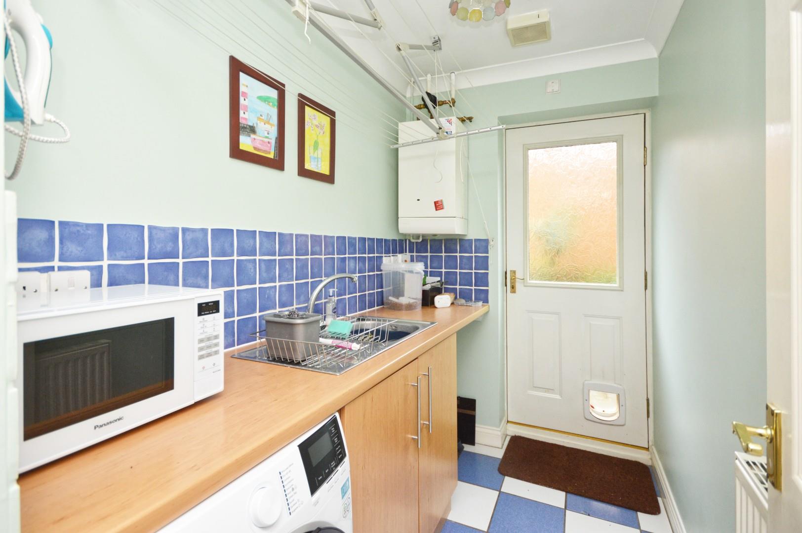 Pedestrian door to side aspect, a range of floor units with worksurface over, sink drainer unit with mixer tap over, space and plumbing for washing machine, single radiator, wall mounted Ideal gas boiler.