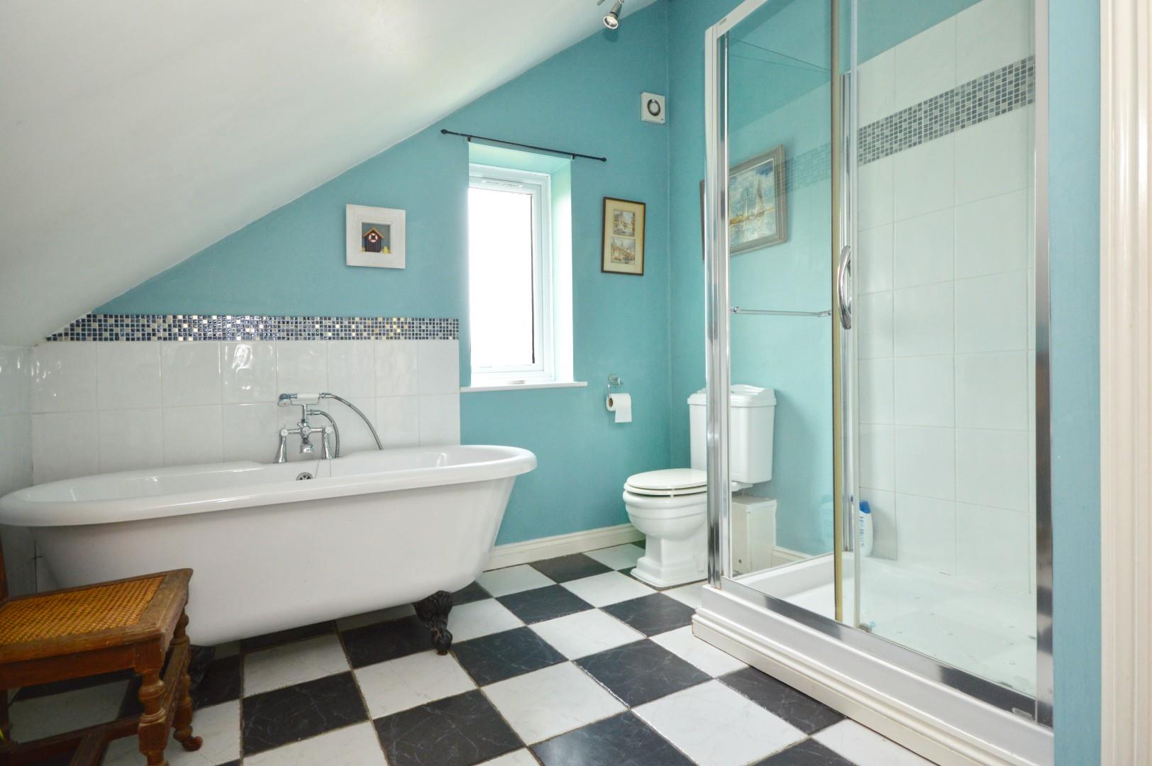Obscured uPVC double glazed window to side aspect, suite comprising period style pedestal wash hand basin, low level w/c, freestanding roll top bath with shower attachment, fully tiled shower cubicle with sliding glazed door and Mira mains shower over, part tiled walls, tiled flooring, double radiator, wall lights, extractor.