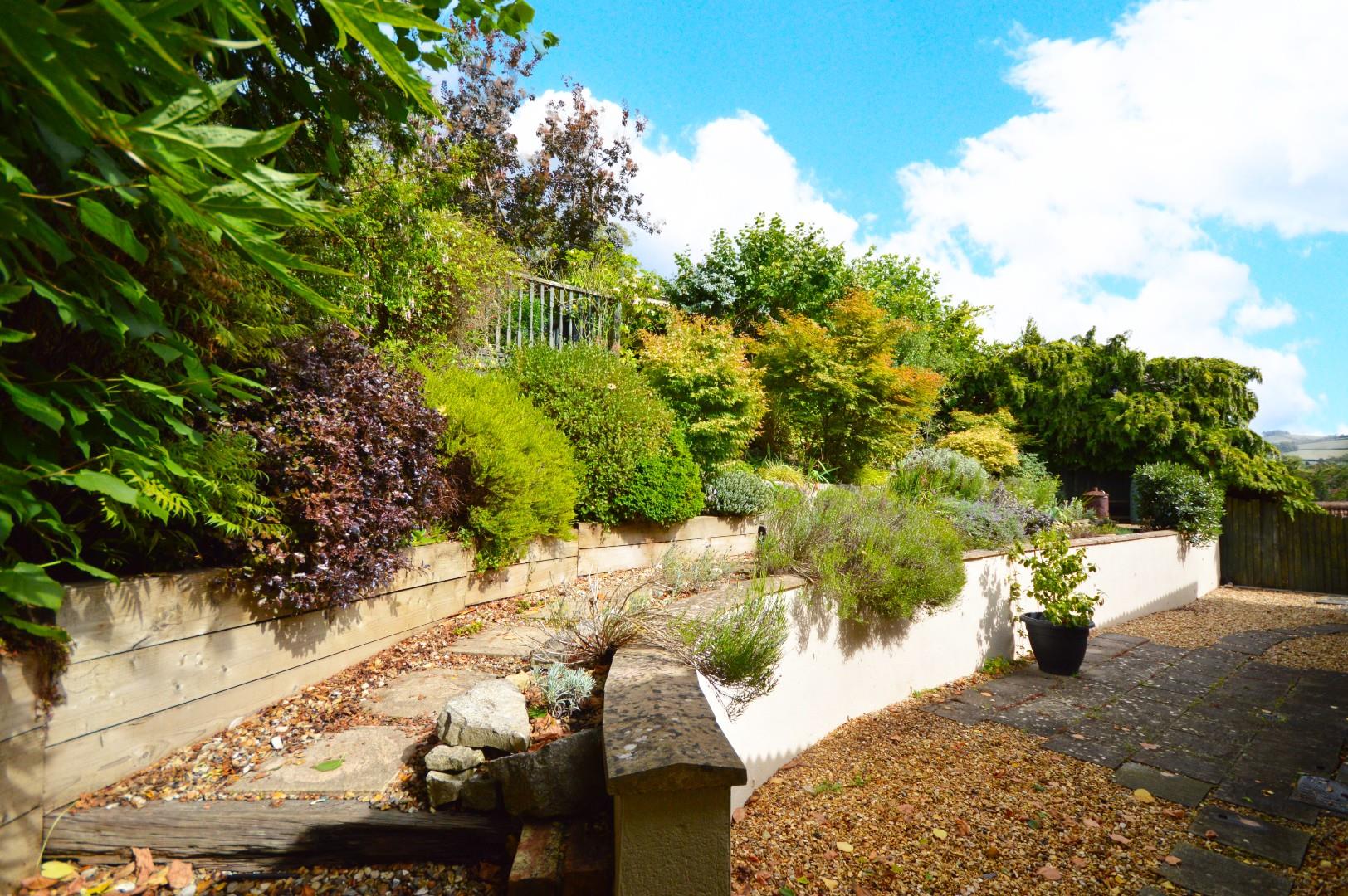 The front of the property has a block paved driveway providing off street parking and access to the double garage, there is a railway sleeper/part slabbed pathway with wrought iron railings giving access from driveway to the front door. There is a raised terrace immediately adjacent to the property ideal for alfresco dining and enjoying pleasant views. There are a good selection of mature trees and shrubs providing a good degree of privacy along with some climbing roses. The front raised terrace is enclosed by wooden fencing with trellis. The rear garden is arranged over different terraced levels and is well stocked with mature plants and shrubs. Adjacent to the rear of the property is a part gravel, part patio slabbed area ideal for garden furniture, with a railway sleeper and gravel path with steps leading up through the different stages of the garden to a raised decked terrace at the top with wooden balustrade. The terrace offers a separate area for bbq's etc enjoying views of the surrounding countryside. The rear garden is enclosed by wooden fencing and trellis. There are wall lights on the rear of the property and an outdoor tap. There is access to the front on both sides. The rear garden offers an excellent degree of privacy.
