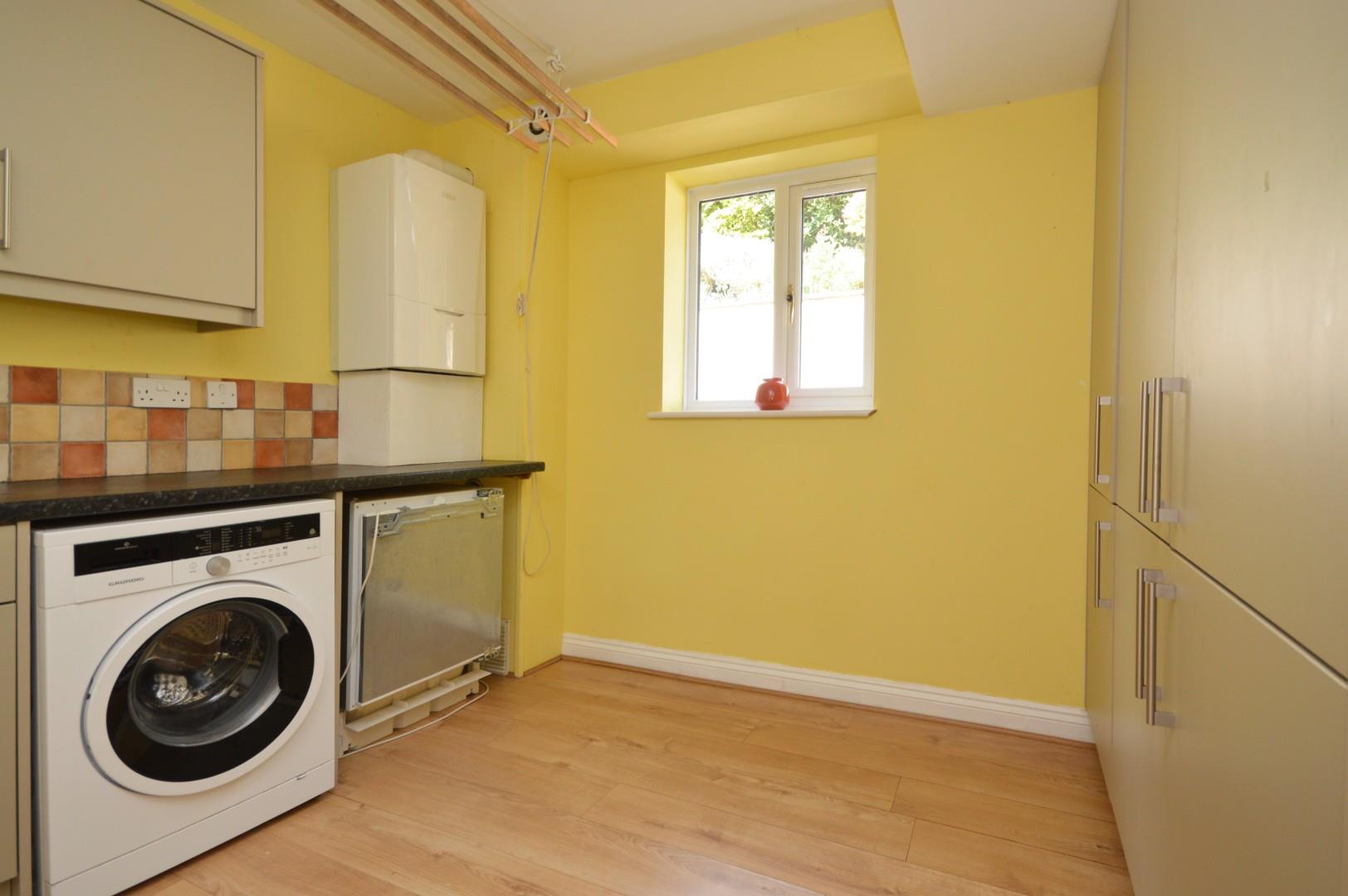 uPVC double glazed window to rear aspect enjoying pleasant views over the garden, further range of wall and floor units with worksurface over, single stainless steel sink drainer unit with taps over, tiled splash backs, space and plumbing for white goods including washing machine and tumble drier, wall mounted Ideal gas boiler, wood effect flooring, wooden door to side aspect.